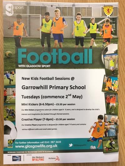 Details of out-of-hours football coaching sesssions at Garrowhill Primary are detailed below (Mini Kickers for age 4-6, Creative Player for ages 7-9). For further information, contact the number at the bottom of the flier (0141) 287 3610.